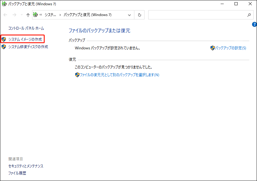 ステップ1.バックアップと復元(Windows 7)で、左のメニューから「システムイメージの作成」を選択し、システムバックアップを起動します。