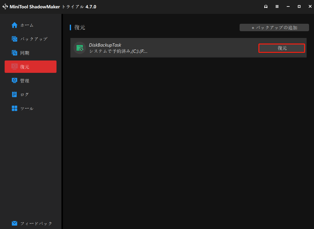 ステップ1.メインインターフェースの左側のパネルから「復元」タブを選択し、右画面で復元したいディスクのバックアップ イメージを選択して「復元」ボタンをクリックします。